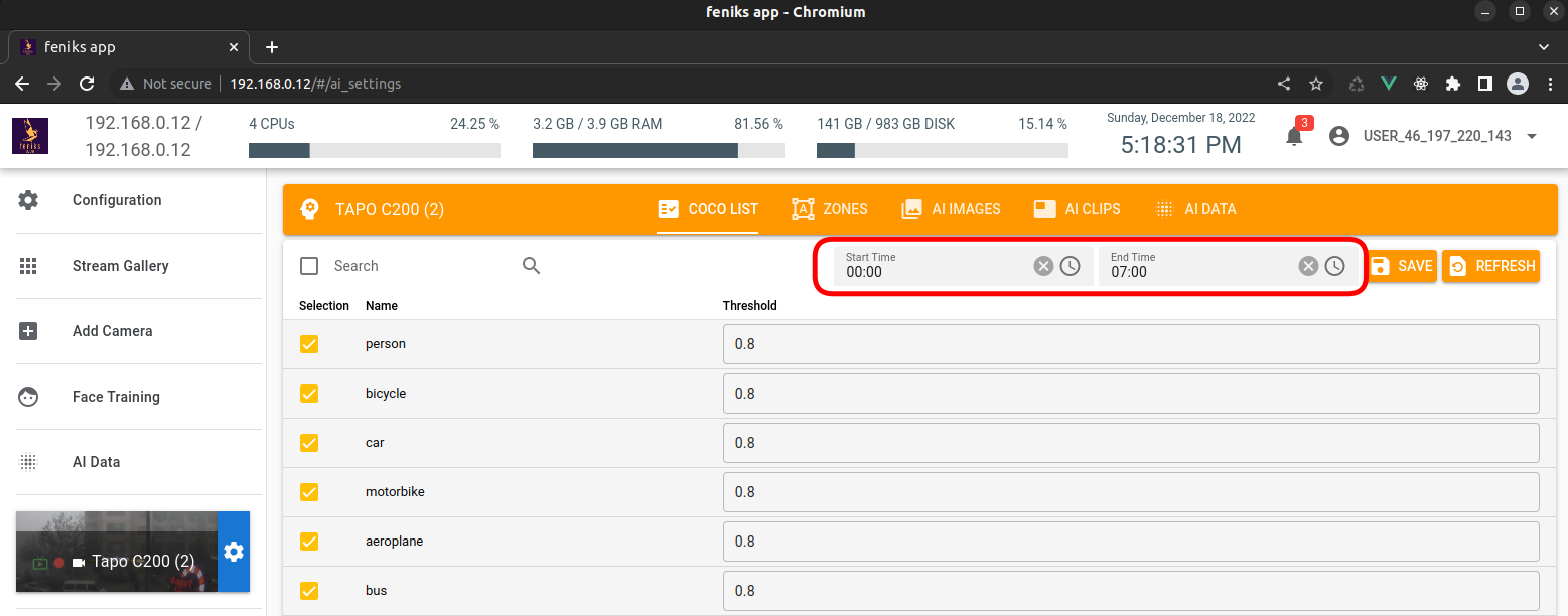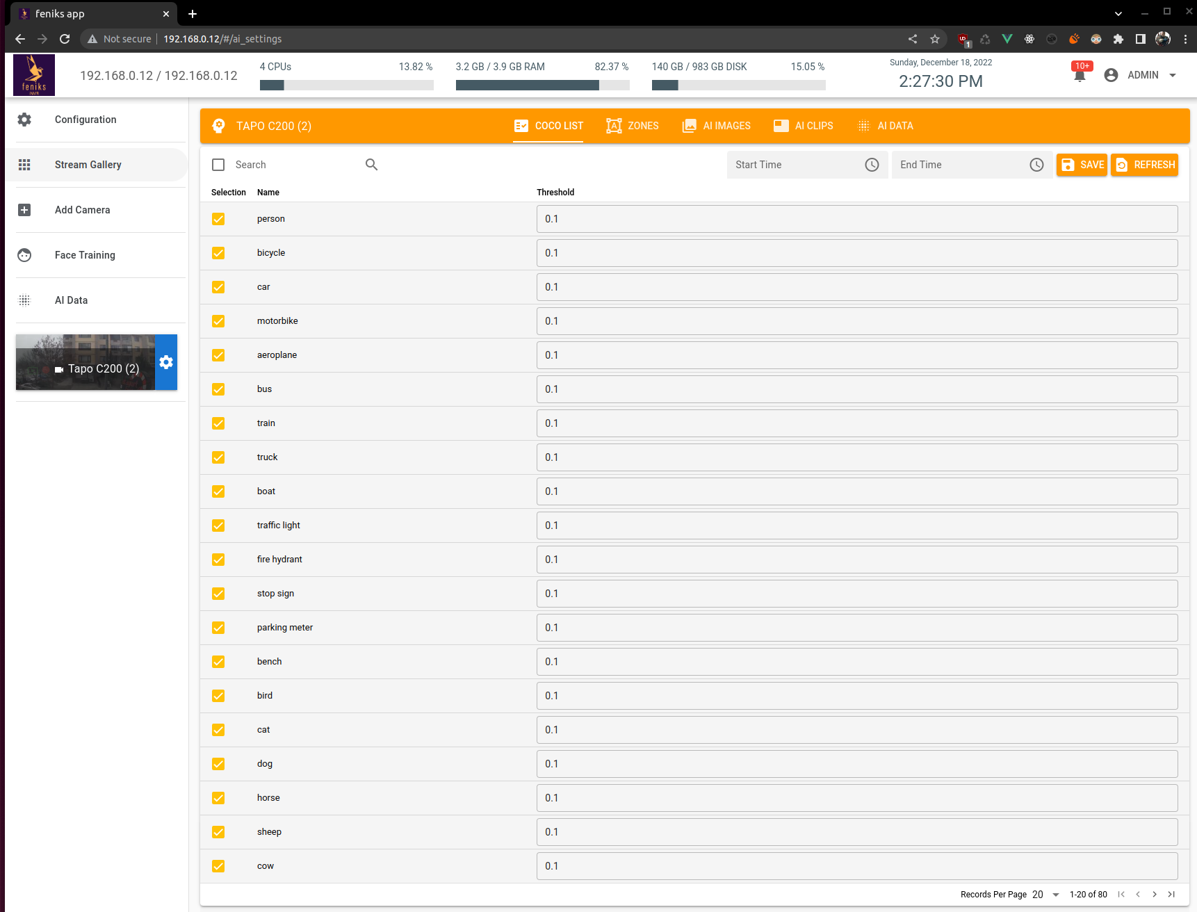 The first section of AI settings is the COCO list where 80 different object thresholds' can be specified for the object detection feature. You can also select which object are being detected or not from this section.